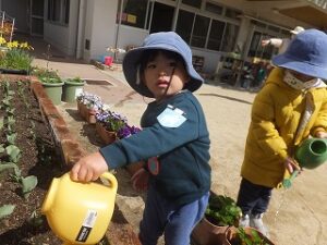 花壇に水やり。